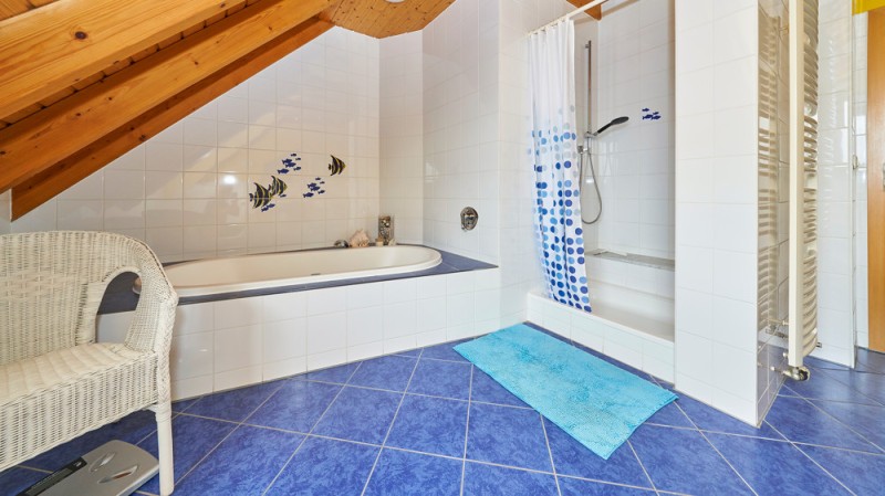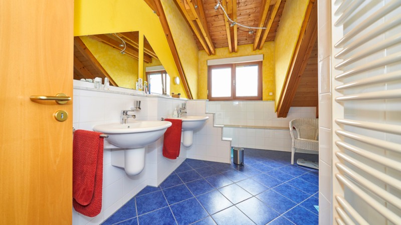 - Tageslichtbad mit Fußbodenheizung, Badewanne, Dusche, Doppelwaschbecken und WC (Fliesen)