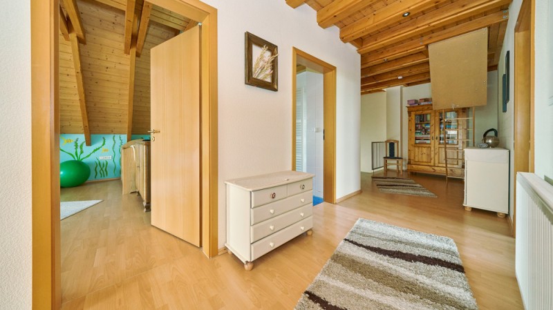 Der ausgebaute, gedämmte Spitzboden mit vorbereiteter Elektrik und Heizung bietet zusätzliches Potenzial.