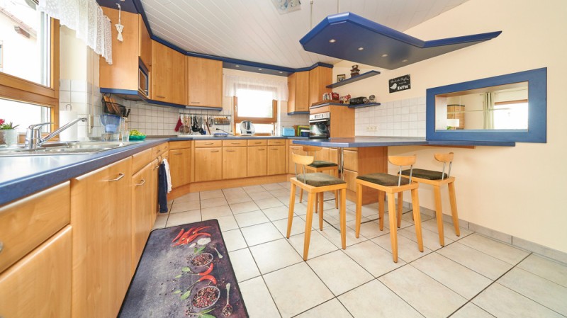 - Küche mit Einbauküche und Theke (Fliesen)