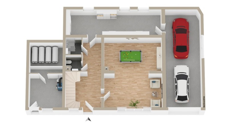 Im Erdgeschoss erwarten Sie ein großzügiger Eingangsbereich mit Granitboden, zwei flexibel nutzbare Hobbyräume, ein Duschbad, ein separates WC sowie ein praktischer Abstellraum mit Zugang zur Doppelgarage.