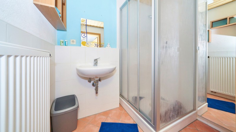 - Badezimmer mit Dusche und Waschbecken (Fliesen)