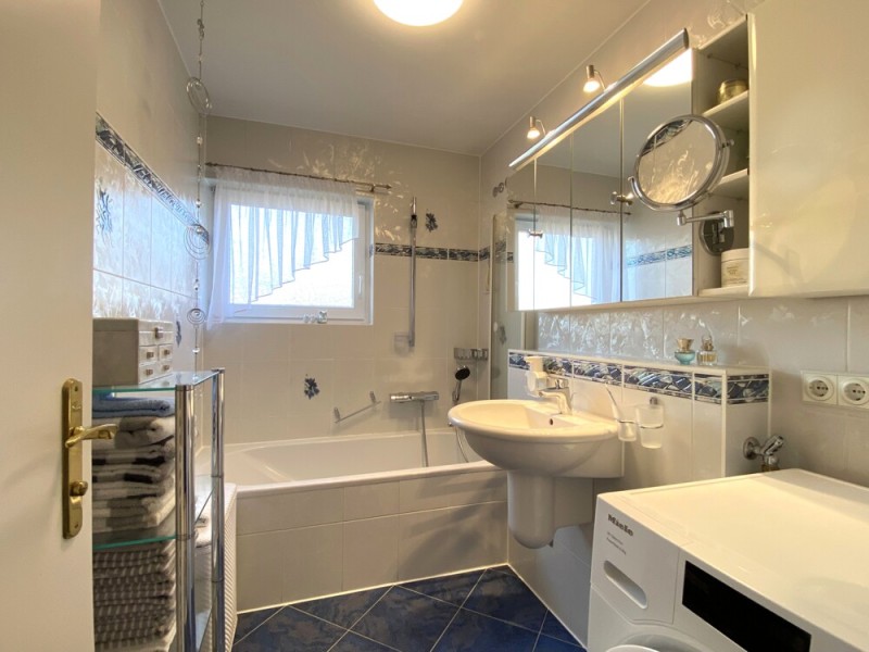 Das helle Tageslichtbad mit Badewanne lädt zum Entspannen ein; ein separates, geschmackvoll gestaltetes WC ergänzt den Sanitärbereich ideal. In der freundlichen und funktional geplanten Einbauküche macht Kochen Freude – sie ist bereits im Kaufpreis enthalten.