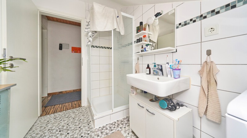 Das Badezimmer präsentiert sich in solider, zweckmäßiger Ausstattung und ist voll funktionsfähig. Für Ihren Komfort ist hier bereits ein praktischer Stellplatz inklusive aller Anschlüsse für Ihre Waschmaschine vorhanden. Ein separates WC erhöht den Alltagskomfort zusätzlich.
