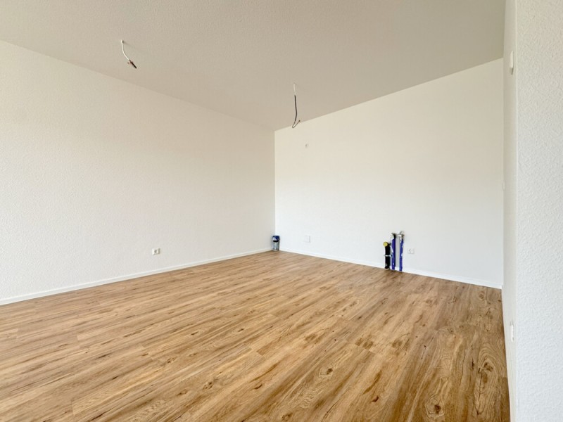 Der elegante Design-Vinyl-Boden verleiht dem Wohn-/Essbereich und dem Schlafzimmer eine warme und einladende Atmosphäre. Der großzügige Flur, ebenfalls mit Design-Vinyl ausgestattet, führt zu einem modernen Badezimmer, das mit einer bodentiefen Dusche, einem stilvollen Waschbecken, einem WC und einer praktischen Handtuchheizung ausgestattet ist. Die Wohnung kann bei Bedarf mit einer Einbauküche ausgestattet werden.