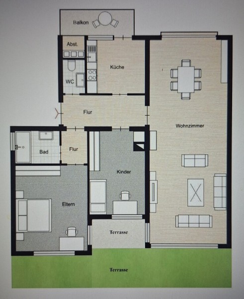 Die Wohnung verfügt über 3,5 Zimmer, darunter ein gemütliches Schlafzimmer, ein weiteres Zimmer und ein mit einer Badewanne ausgestattetes Badezimmer, sowie eine Küche. Die helle und einladende Atmosphäre mit Echtholzparkett im Wohn-/ Essbereich wird durch eine Terrasse und einen Balkon mit Besenkammer ergänzt, die Ihnen wunderbare Möglichkeiten bieten, den Tag im Freien zu genießen. Zudem steht Ihnen eine großzügige Terrasse zur gemeinschaftlichen Nutzung zur Verfügung.