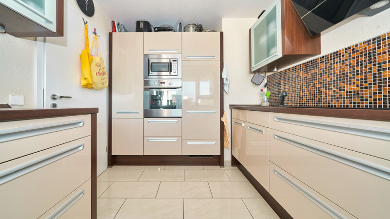 - Küche mit sämtlichen Geräten und hellbrauner Front (Fliesen)