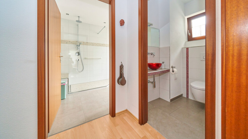 An der Küche vorbei führt der linke Bereich des Geschosses an Garderobe und dem modernisierten Gäste-WC zum ebenfalls modernisierten Tageslichtbad mit Dusche und WC.