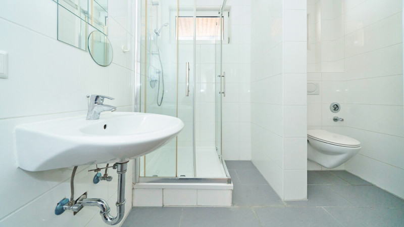 Das Tageslichtbad ist praktisch ausgestattet und verfügt über eine Dusche sowie ein Waschbecken. Eine kleine Abstellkammer innerhalb der Wohnung sorgt für zusätzlichen Stauraum und erhöht den Wohnkomfort im Alltag. Weitere Abstellmöglichkeiten befinden sich außerhalb der Wohnung und bieten zusätzlichen Platz.