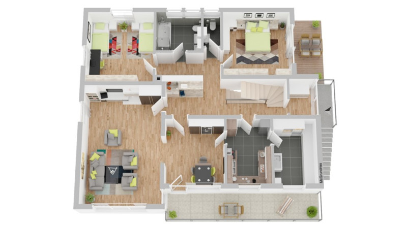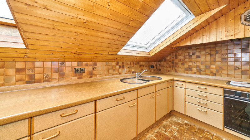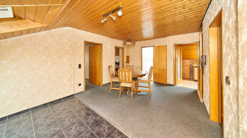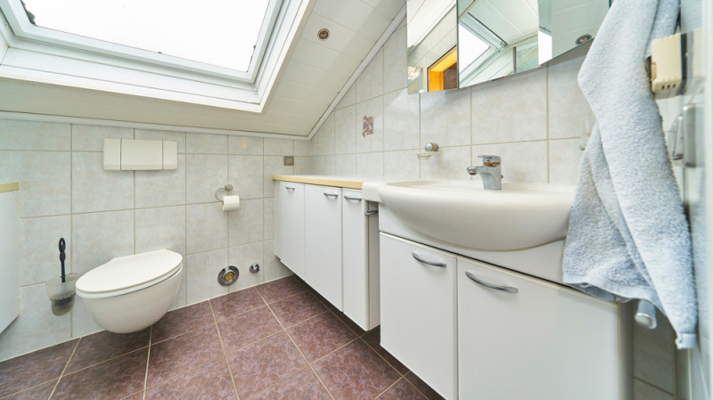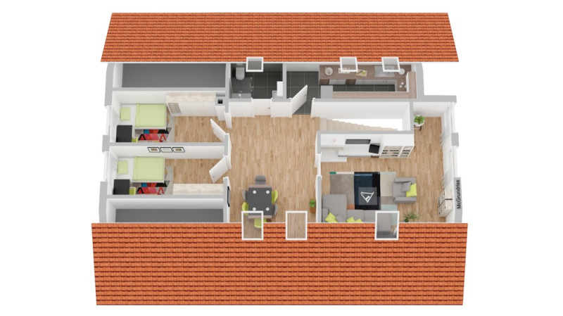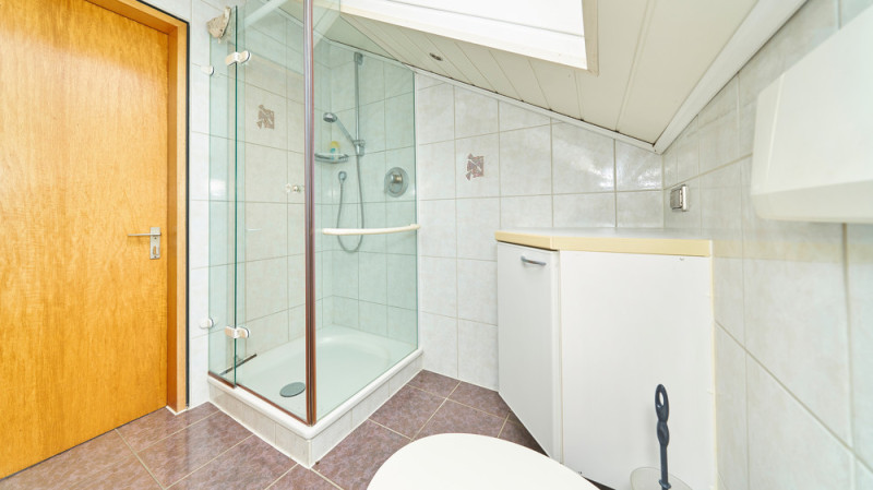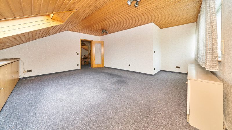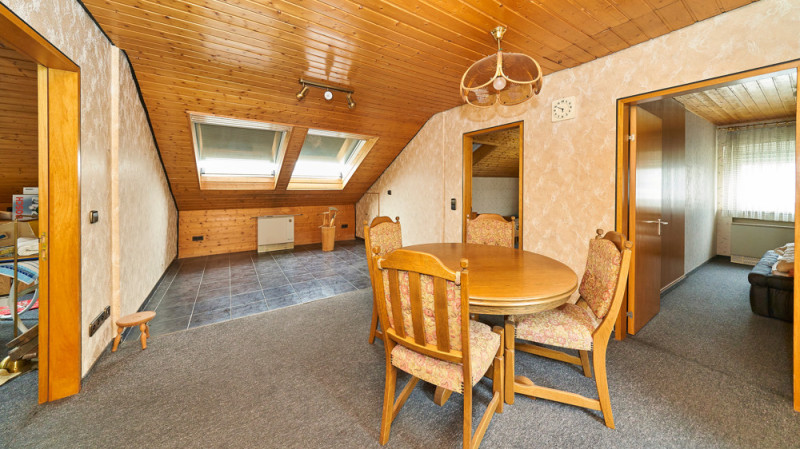 Im Dachgeschoss (ca. 58 m² Wohnfläche, größere Grundfläche durch Dachschrägen) befinden sich zwei Schlafzimmer, ein Wohnzimmer, ein Essbereich, eine Küche und ein Tageslichtbad mit Dusche – ideal als separate Einheit für Jugendliche oder Gäste.