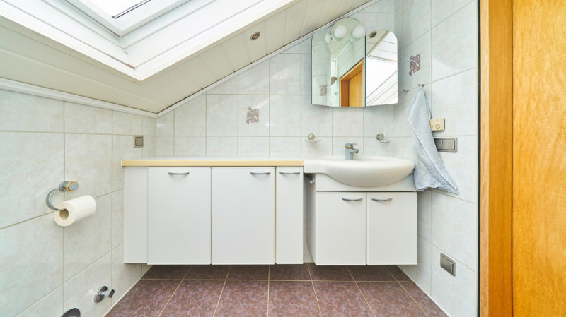 - Tageslichtbadezimmer mit Dusche, Waschbecken und WC (Fliesen)