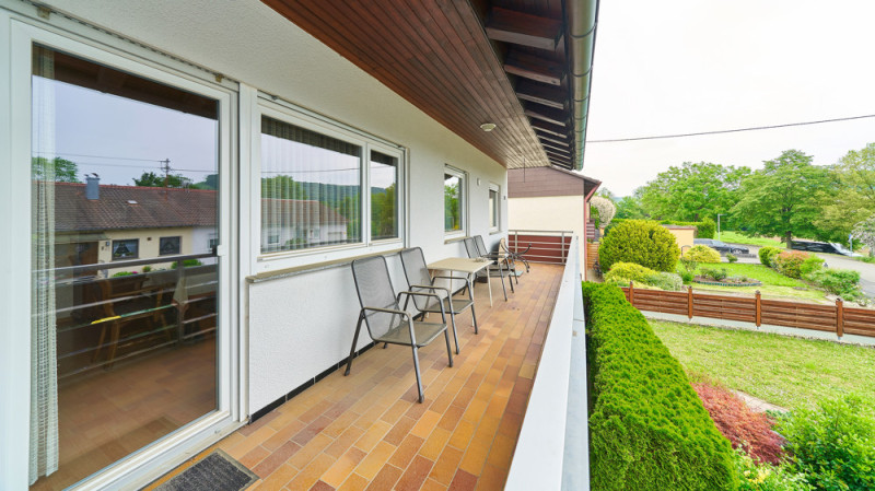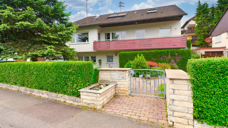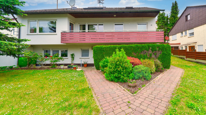 Die Hauptwohnung mit ca. 143 m² Wohnfläche erreichen Sie über den gepflegten Vorgarten. Ein zentraler Flur verbindet alle Räume: zwei helle Schlafzimmer, ein großzügiges Wohnzimmer mit Zugang zum Südbalkon, Esszimmer, Küche mit Hauswirtschaftsraum, Tageslichtbad mit Dusche, Wanne, Doppelwaschbecken und Bidet sowie ein separates WC.